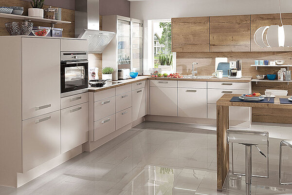 Typisch für klassische Küchen sind glatte oder dezent strukturierte Fronten in den Farben Weiß, Creme, Magnolia oder Sandgrau. Wer es edler mag, entscheidet sich bei den Möbeln für sanfte Naturtöne, Stein- oder Holzoptiken. Matte oder glänzende Lackoberflächen sind gleichermaßen möglich und machen die Küche pflegeleicht und langlebig.