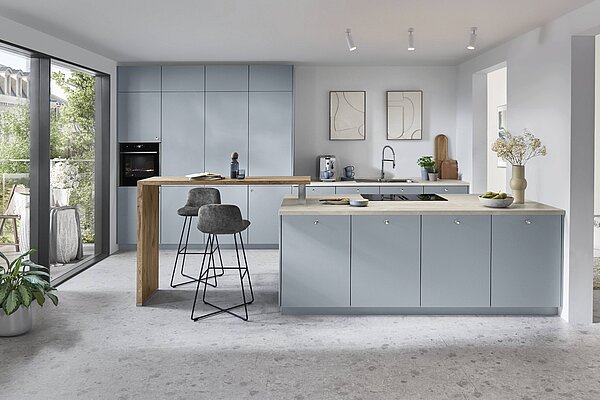 Typisch für diesen Stil sind glatte Flächen, reduzierte Formen und edle Griffe oder Griffleisten, die sich dezent zurücknehmen. Durchgehende Hochschrankfronten, gerade Linien und offene Raumlösungen verleihen der Küche eine klare, moderne Ausstrahlung. Besonders schön wirken Kombinationen aus matt lackierten Oberflächen oder Anti-Fingerprint-Beschichtungen mit natürlichen Materialanmutungen wie Holz, Stein oder Beton. Stilvolle Vitrinen, offene Regale und clever eingesetztes Licht setzen besondere Akzente und machen die Küche zum neuen Lieblingsort im Zuhause.